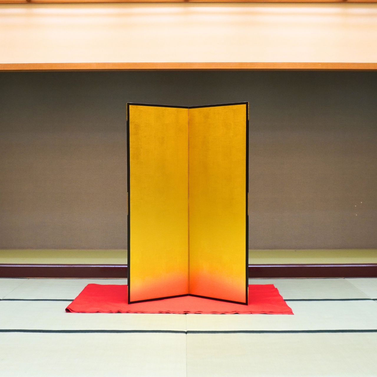 2曲仕様は式典の背景だけでなく、茶室の設え、控室の間仕切り、プライバシー確保などにも活用できる汎用性の高さが魅力。