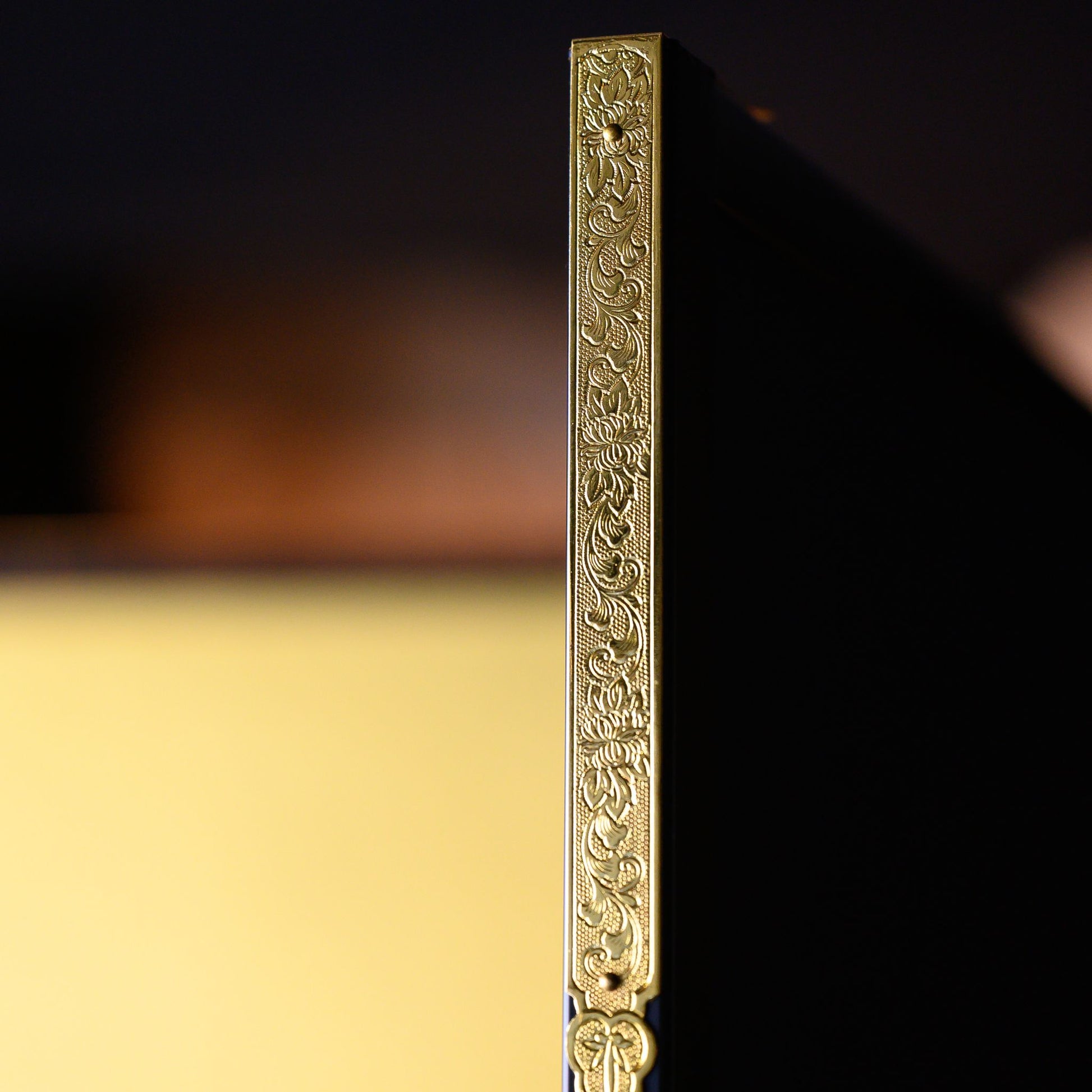 金メッキの唐草模様金具、黒アルミの縁取り、丁番には紙丁番+布丁番を使用。細部にまでこだわった仕上がりです。