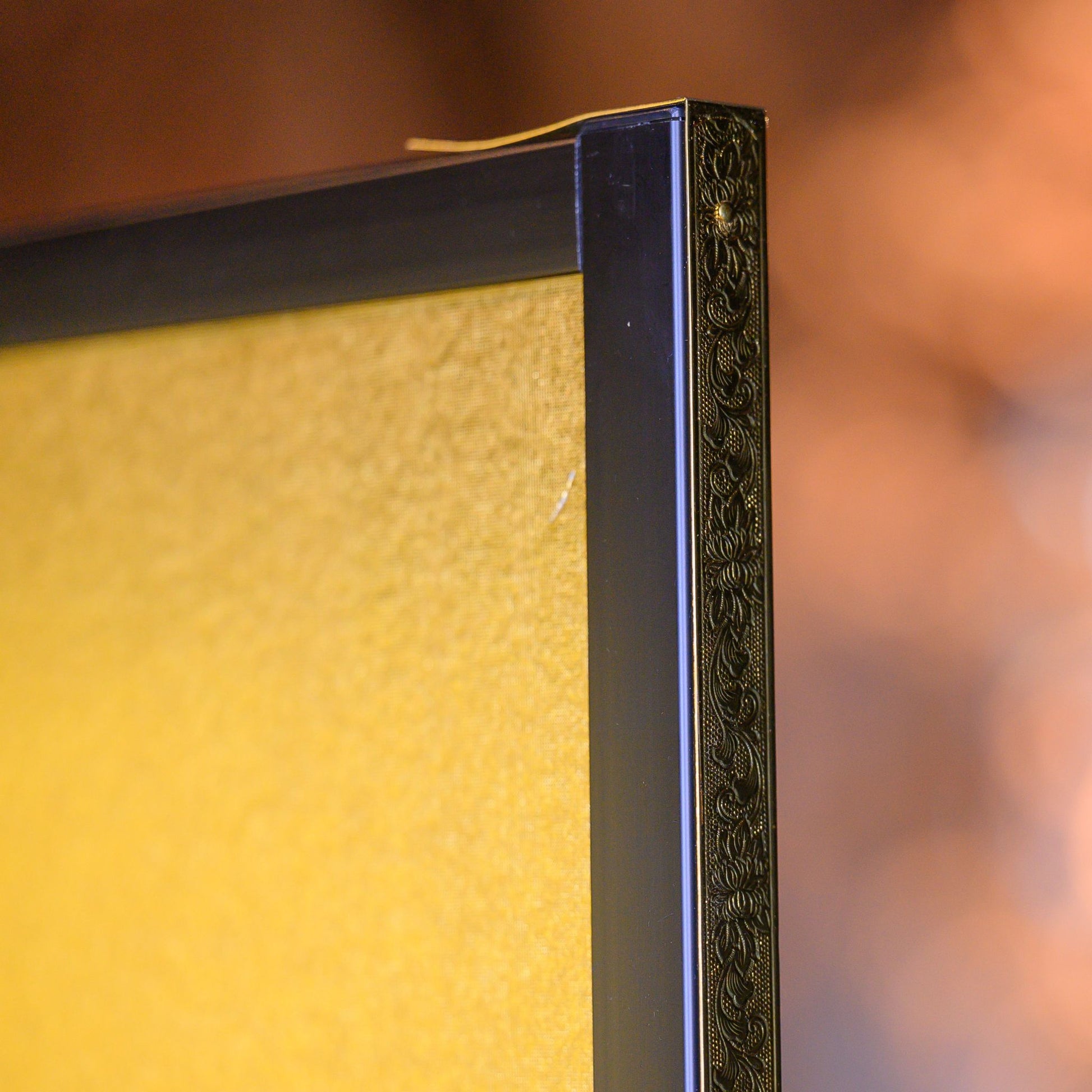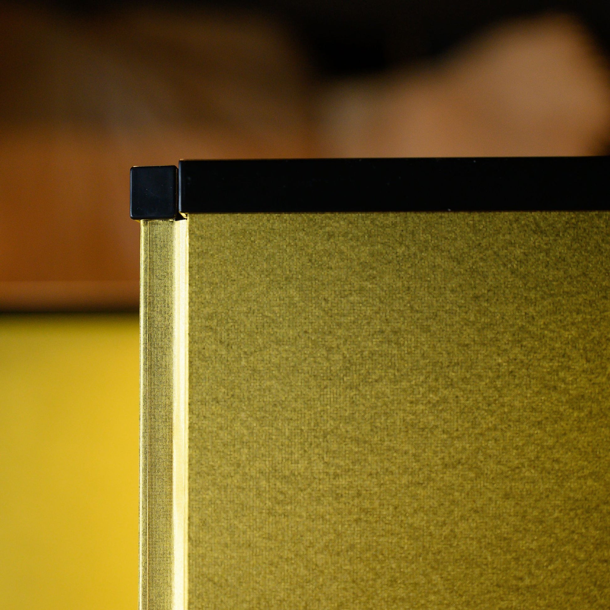 扱いやすさが魅力の2曲屏風。軽量で設置も簡単、式典や控室、茶席など幅広く活躍。新洋金絹目仕上げで上品な印象です。
