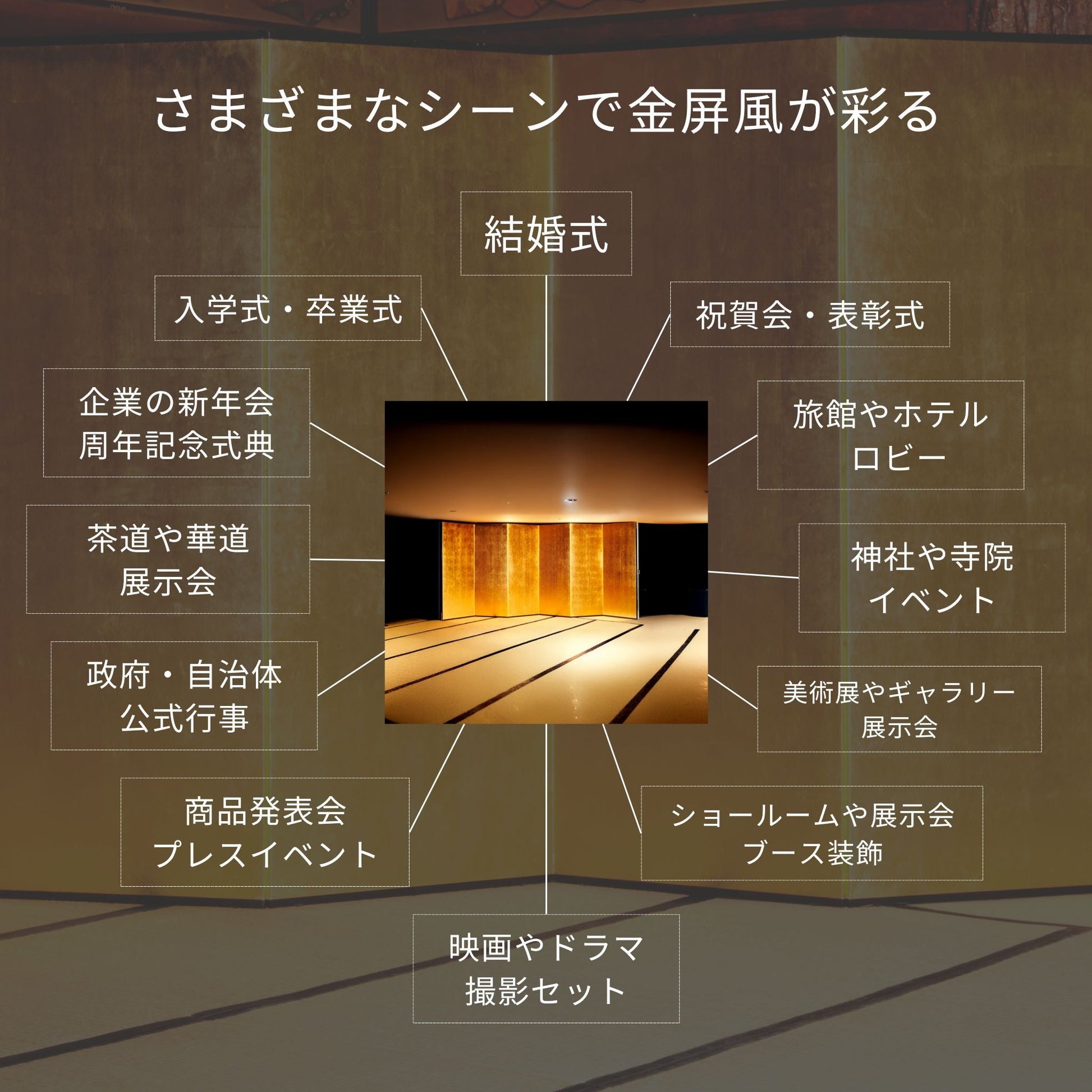 式典で最も定番とされる6曲屏風。軽量で運びやすく、新洋金絹目が美しい背景を演出。慶事や公式行事に最適です。